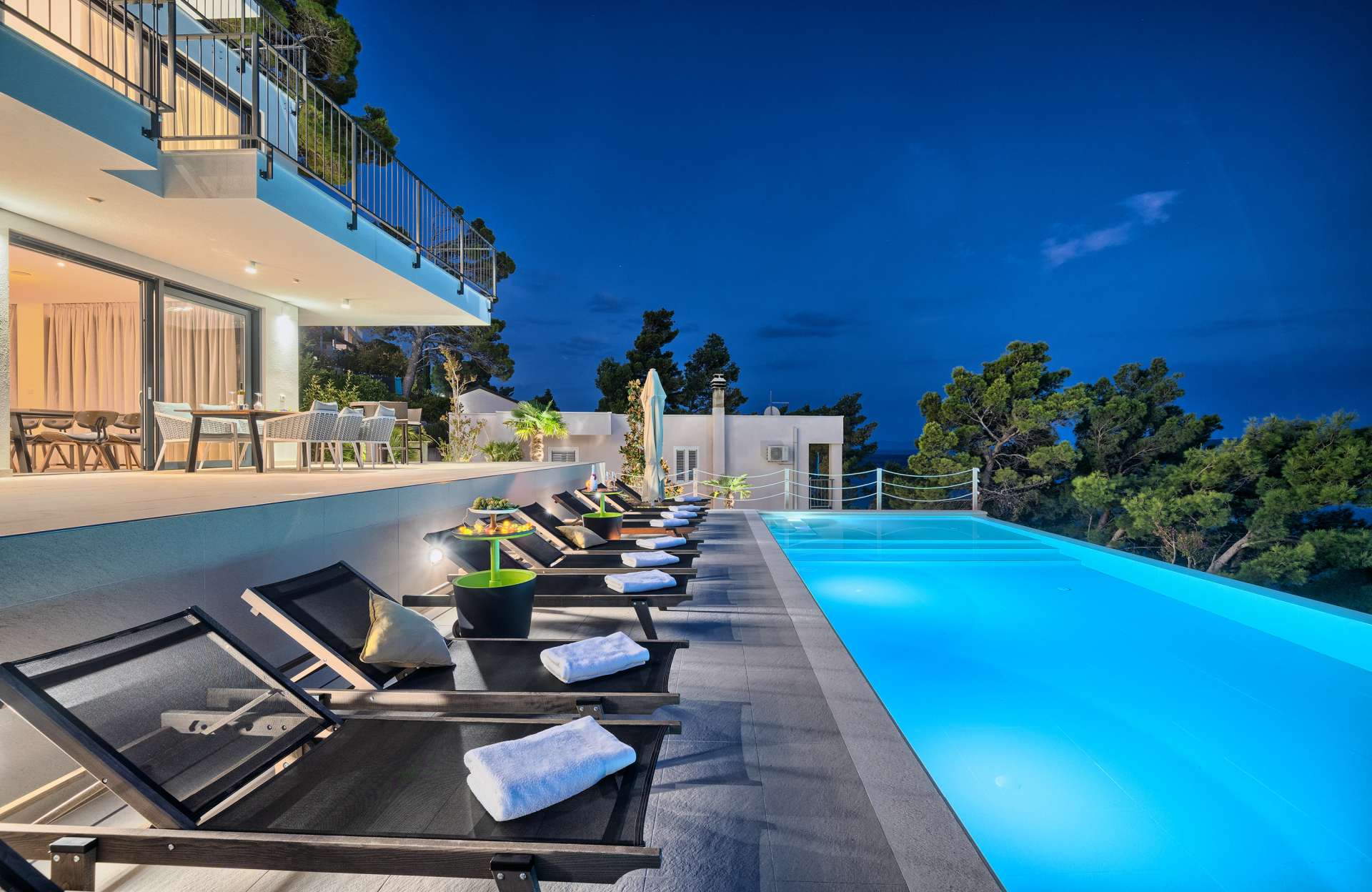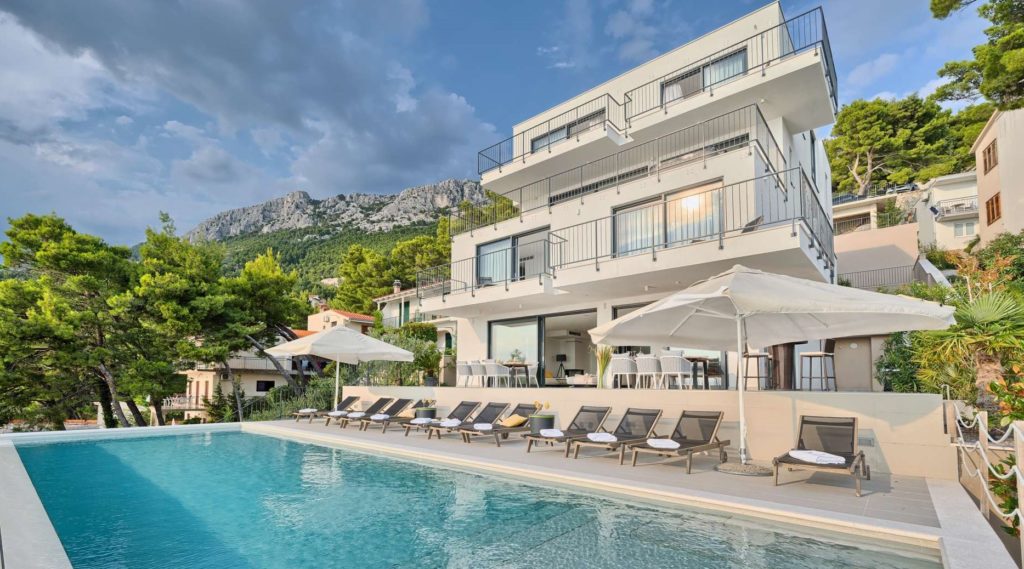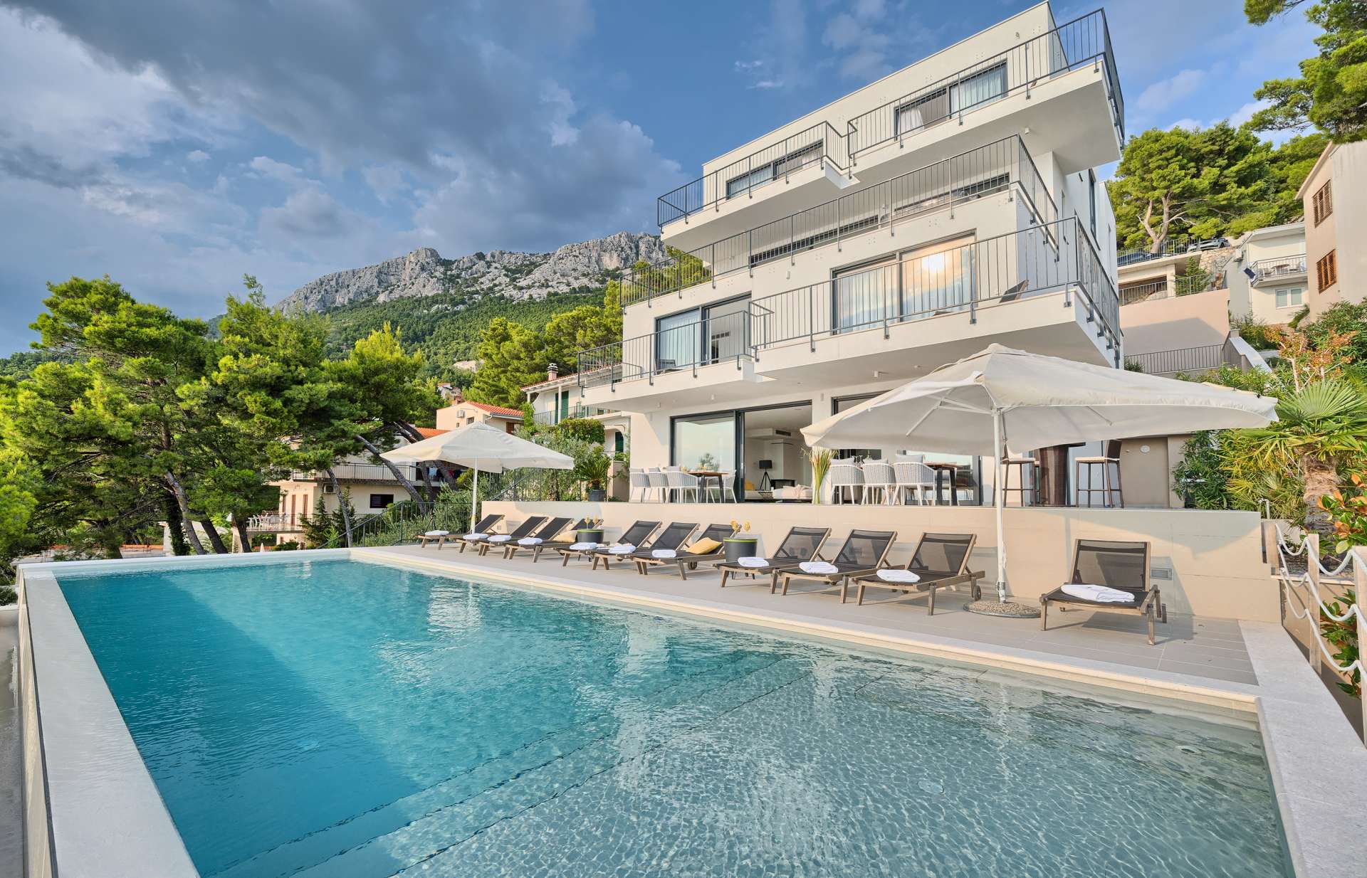 Dieses großzügige Anwesen, sicher eines der luxuriösesten Objekte an der ganzen Makarska Riviera, erstreckt sich über vier Etagen und verfügt über 9 helle Schlafzimmer mit Bädern en-suite, eine voll ausgestattete Küche mit Essbereich, ein gemütliches Wohnzimmer sowie 10 Badezimmer und bietet somit ausreichend Platz für mehrere Familien oder eine große Gruppe. 20 Personen, davon sind 18 Erwachsene und 2 Kinder zu empfehlen, finden hier ausreichend Platz. Es gibt 8 Schlafzimmer in der Villa und ein zusätzliches Apartment mit separatem Eingang, ein Schlafzimmer, ein Badezimmer und einen Wohnbereich mit Schlafsofa. Die Wohnung ist auch Teil der Villa.